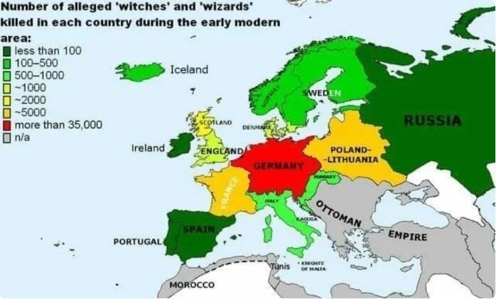 В Испании так мало, потому что там больше еретиков жгли, а про ведьм думали, что они занимаются самооговором и не казнили.