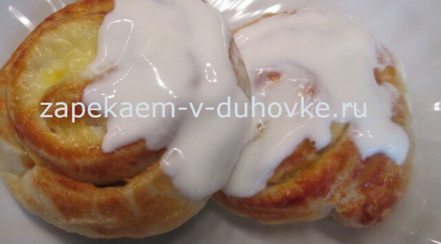 Такие знакомые и многими любимые ароматные ватрушки с творогом.Но я предлагаю вам попробовать ватрушки в сметанной заливке. Что может быть проще в приготовлении и вкуснее?! С добавлением лимонных цукатов и изюм получается прекрасный десерт. А сметанная заливка еще теплых ватрушек делает их невероятно вкусными - еще нежнее и сочнее. Какое приятное начало дня - чашечка кофе и ватрушка с творогом в сметанной заливке! Из указанного количества ингредиентов получается примерно 20 ватрушек. Готовое слоеное тесто позволит сделать приготовление быстрым и нехлопотным. Рецепт на 5-6- персон, время приготовление 50 минут Как готовить сырные ватрушки с творогом в сметанной заливке Нам понадобятся следующие ингредиенты: тесто слоеное дрожжевое 800 г