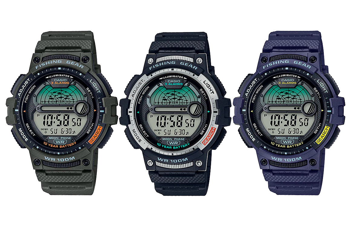 Дабы не обидеть серию, WS-1200H относятся к линейке OutGear. Это такие себе ProTrek на минималках, что наверняка понравится всем любителям бюджетного туризма. Если вы видите надпись “Fishing Gear”, значит должны быть обозначения хорошего времени для клева [речь о рыбалке, конечно же]. Так вот, верхнее окошко циферблата как раз и отвечает за клёв, где дизайнеры изобразили его в виде радара. Согласитесь, выглядит потрясающе.