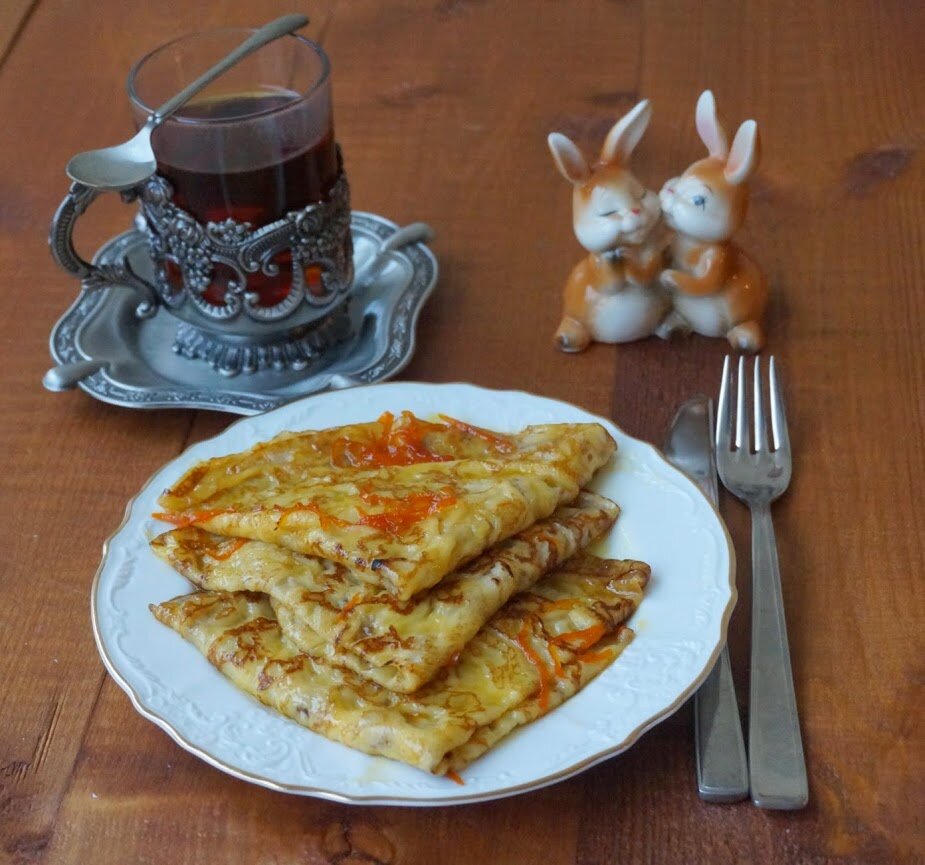 Блины сложить треугольником, выложить в сковороду, залить соусом. Сверху полить ликером и поджечь.