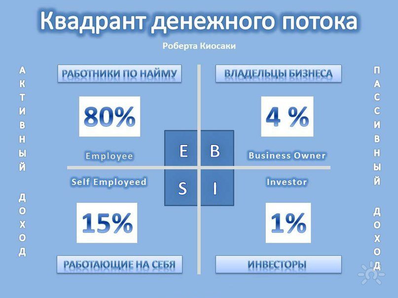 Квадрант денежного потока делится на четыре типа людей, по два в каждой категории.