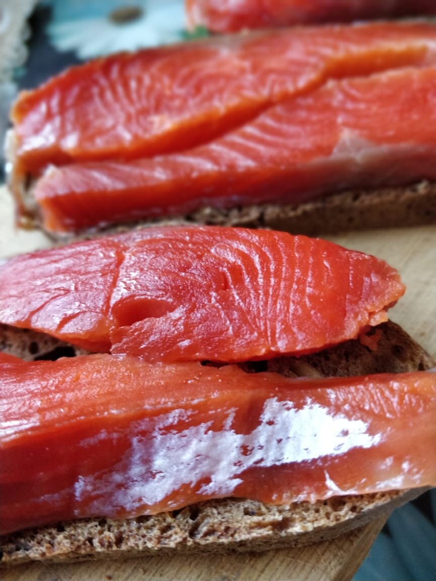 Привет всем. Хочу поделиться с вами простым и быстрым рецептом засолки нерки. В принципе, так можно солить любого лосося, но нерка подходит под такой посол, как нельзя лучше. Супруга моя работает в фирме, связанной с рыболовными компаниями и иногда у нас есть возможность покупать лосося свежего вылова и хорошего качества. Мы его слегка дефростируем, разбираем блок на отдельные тушки, режем тушки поперёк, примерно в районе спинного плавника икладём на хранение в морозилку. Для засолки я беру половину тушки, это кусок, весом примернр 1 кг. Размораживаю, чищу от чешуи, промываю водой и промакиваю бумажным полотенцем. Затем филеровочным ножом вырезаю из этого куска плавники и хребет. Когда их накапливается достаточно, из них варится замечательная уха. Затем беру небольшую баночку и смешиваю в ней две столовых ложки поваренной соли крупного помола и одну столовую ложку сахара. Затем берём продолговатую миску, подходящую по размеру, в которой мы будем солить нашу рыбу. И слегка присы