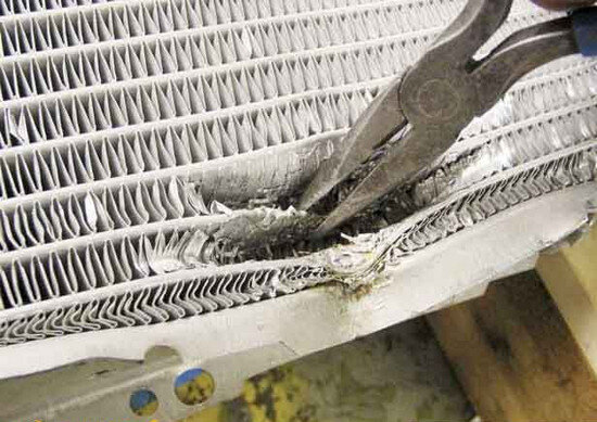 Самая распространенная проблема, когда из-за старости появляется течь радиатора. Охлаждающая жидкость (ОЖ) выбегает из мест соединения металла и пластика, что автоматически ведет к перегреву двигателя. Найти в замену новый радиатор получается не всегда, да и ремонт обойдется, как минимум в 2 раза дешевле нового. Дальнейшая речь будет идти об автомобильных радиаторах в целом и не важно, будет это ремонт радиатора отопителя, радиатор кондиционера или радиатор системы охлаждения двигателя.