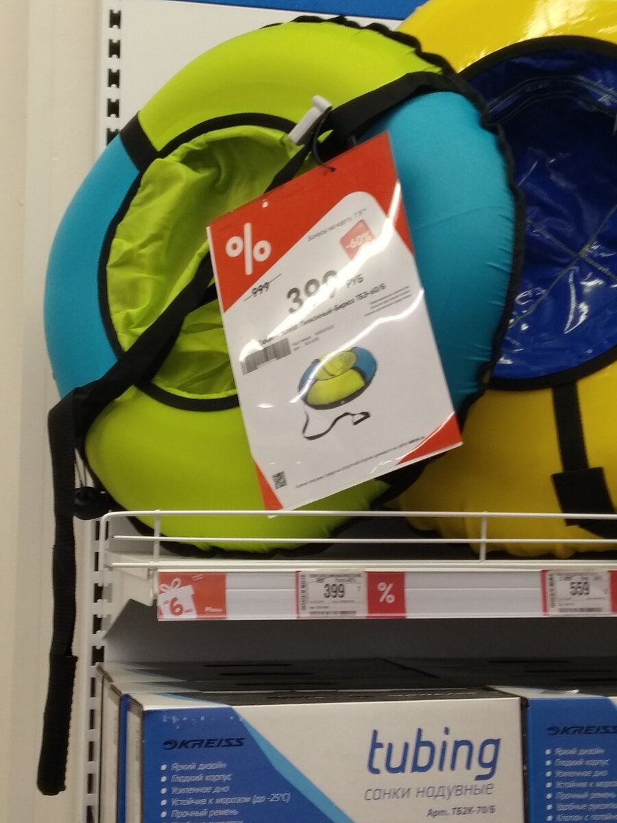 Приветствую тебя дорогой мой читатель! Вы на канале “Следом за детьми”. Мы любим с детьми зиму, ведь в холодный период года много развлечений на улице. Катаемся на лыжах, коньках, тюбингах… На дворе весна, а это значит, что в магазинах города стартовали скидки на зимний спортивный инвентарь. Это для нас большая радость, так как мы можем приобрести инвентарь по сниженной цене. Представляю Вам подборку скидок на детский зимний спортивный инвентарь в сети магазинах “Детский мир”. Надеюсь, мой обзор кому-нибудь пригодится. Трансляция ведется из города Набережные Челны республики Татарстан. Чем известен наш город? А тем, что в нашем городе выпускают КамАЗы. Все представленные фотографии были сделаны лично мной. 1. Открывает наш обзор - тюбинг за 399 рублей, -40% от изначальной цены. Тюбинг не большого размера, подходит для ребенка до 5 лет. 2. Два вида ледянок - за 149 рублей и 99 рублей. Внимание!!! Обзор представлен сети магазинов нашего города. И ни в коем случае я Вас не призываю