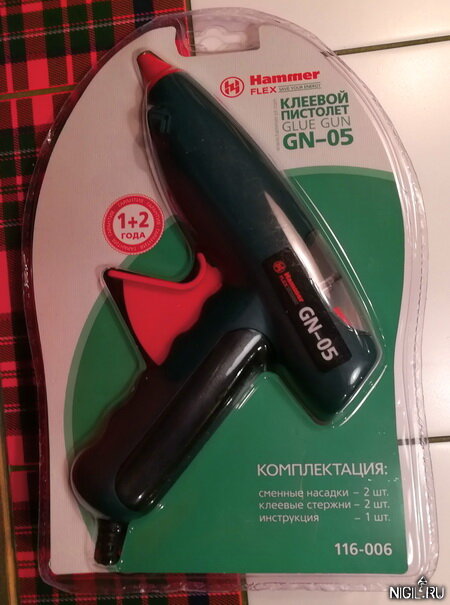 Купил себе такой вот клеевой пистолет Hammer FLEX GN-05: До этого никогда клей-пистолетом не пользовался, но как и предполагал оказалось это не сложнее, чем работа с жидкими гвоздями, а в чём-то даже проще. Появилась необходимость склеить некоторые сложные предметы в том числе из стекла. Мне до этого рассказывал знакомый бармен, что подобным клеем приклеивали отломанные ножки к фужерам в баре и всё прекрасно держалось. Да, действительно клей очень мощный, а пистолет удобный в использовании. Теперь буду отдавать предпочтение ему, а не всяким там "суперклеям" и жидким гвоздям, там где это возможно и удобно. Принцип действия клеевого пистолета Если кто не знает, то принцип действия клей-пистолета такой: 1. Устанавливаете клеевой стержень в предназначенную для этого отверстие в пистолете и доводите нажатием курка до конца в нагревательную камеру; 2. Включаете пистолет в розетку; 3. Ждёте 4-5 минут пока клей разогреется; 4. Можно пользоваться: нажимая на курок выдавливаете необходимое кол