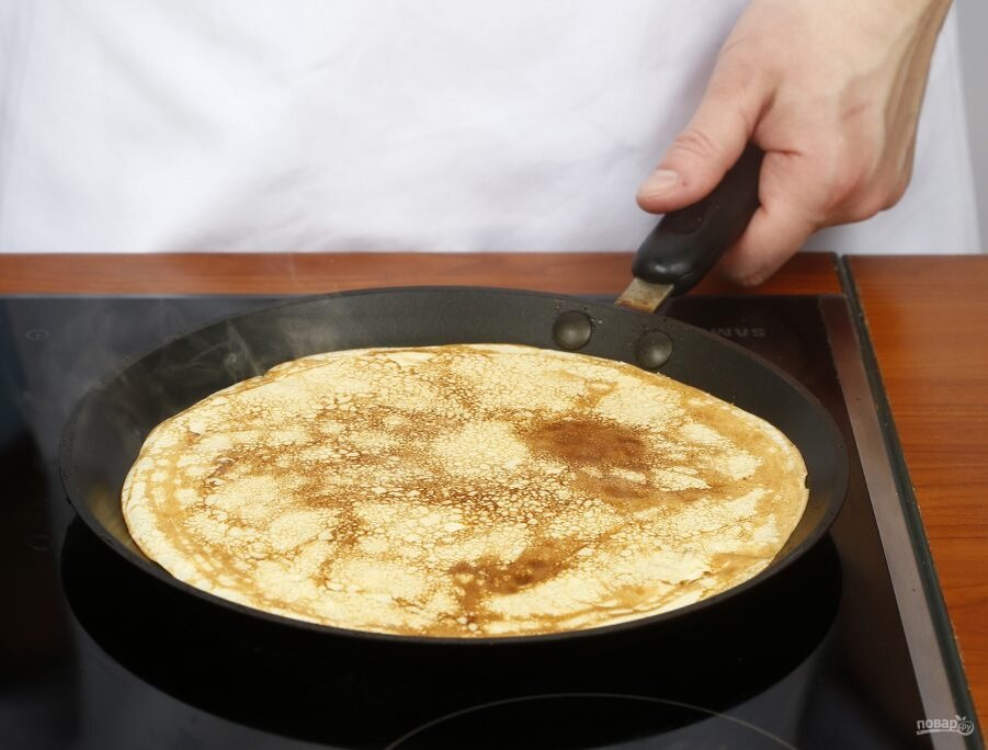 Нагрейте сковородку, смажьте ее растительным маслом или кусочком шпика, наколотым на вилку. На раскаленную сковородку налейте теста столько, чтобы можно было разлить его тонким слоем по всей сковороде. Обычно для этого достаточно половины половника.