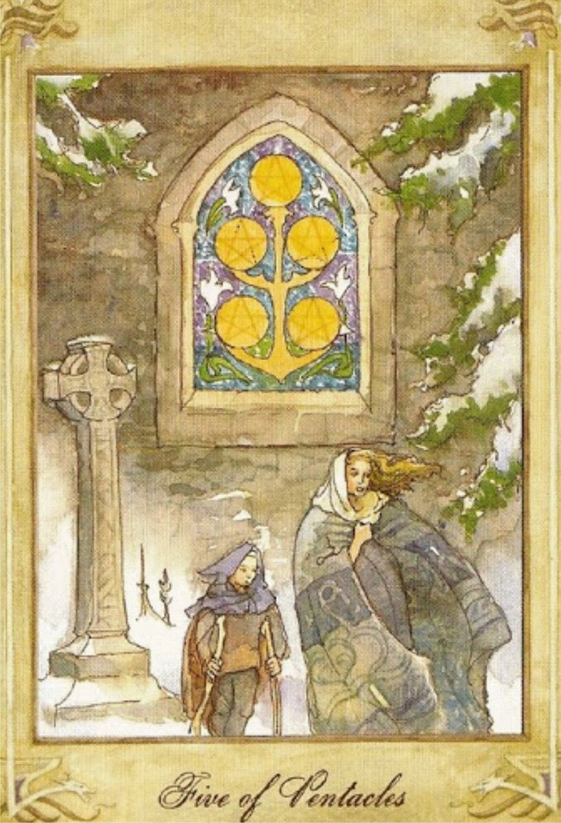 Жизнь дала трещину. И выбросить жалко, и нести тяжело. Полная внутренняя уверенность что это старое никогда не станет новым. В этом главная суть пятёрки пентаклей, во внутренней опустошённости. Счастливый человек прежде всего уверен в своём счастье. Больной уверен в своей болезни. Когда сирый и убогий начинает прикладывать денежку к денежке он перестаёт быть сирым и убогим. Это и есть главная проблема ситуации. Вопрошающий должен перестать себя жалеть и обязан сказать себе: Всё. Я начинаю жить по другому. И есть ещё другая трактовка этой карты. Верность. Сейчас нам очень плохо, но я поддержу тебя, а ты поддержишь меня. Вместе выживем.