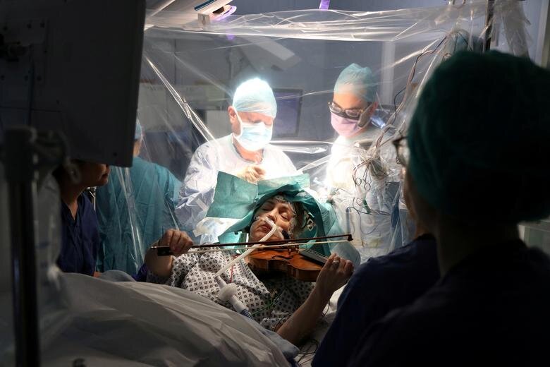 Лондон, Великобритания Врачи удаляют опухоль из мозга 53-летнего Дагмара Тернера. Во время операции Тернер, который был дирижером оркестра, играл на скрипке.