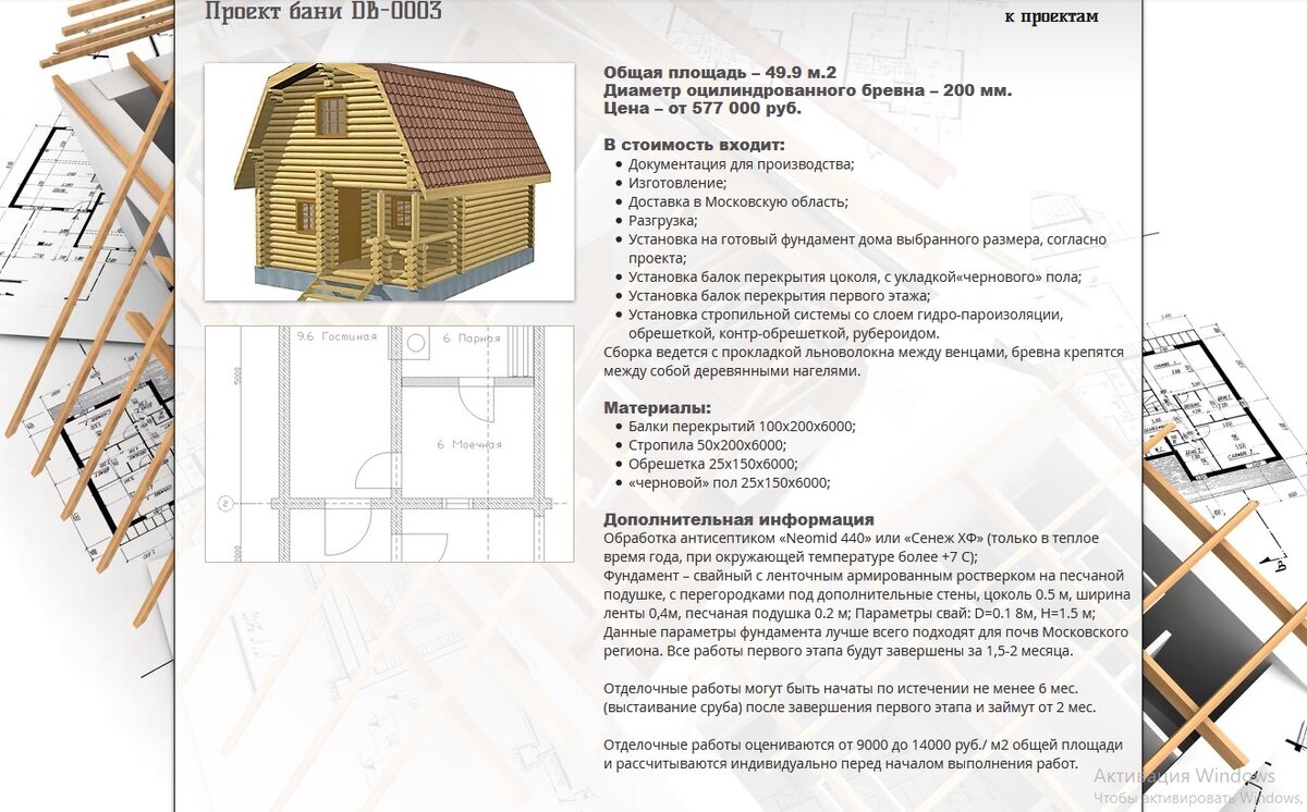 Основная информация на нашем сайте А вот и ещё один банный проект для тех людей кто задался вопросом -" Что первично, баня или дом?" Наше предложение снимает этот острый вопрос с повестки дня. Два в одном - чем не актуальное предложение, которое позволит вам не дожидаться естественного подогрева близко лежащих водоёмов, а соблюдать личную гигиену даже в первый год строительства) Поддал парку, отвёл душу и на второй этаж спать в тёплой комнате, ведь печь от парилки будет прогревать и сами жилые помещения. А если комната оббита ровной, качественной, кедровой вагонкой, то ваш сон будет глубоким, с добрыми сновидениями) Общая площадь – 49.9 м.2 Диаметр оцилиндрованного бревна – 200 мм. Цена – от 577 000 руб. В стоимость входит: Сборка ведется с прокладкой льноволокна между венцами, бревна крепятся между собой деревянными нагелями. Материалы: Дополнительная информация Обработка антисептиком «Neomid 440» или «Сенеж ХФ» (только в теплое время года, при окружающей температуре более +7 С); Фу