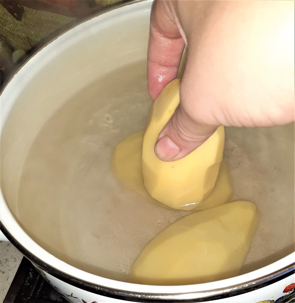Завтра начинается пост и борщ я сварю без мяса. Ставлю греться кастрюлю с водой. Чищу картофель - мне надо 5 штук размером больше среднего. Вода закипела и я опускаю целые картофелины в кастрюлю. Добавляю ст.л. соли без горки.