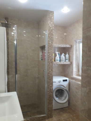 Все трубы уложены в стены, так же сделали небольшую перегородку в виде ниши из гипсокартона под стиральную машинку.