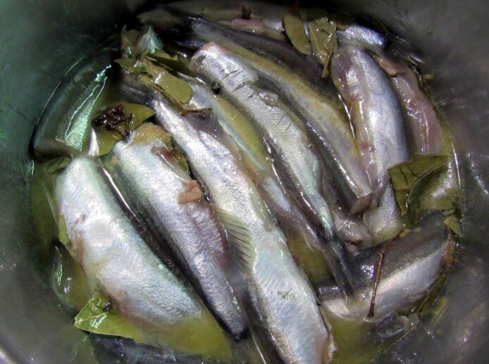 Многие совершенно незаслуженно забывают про такую чудную рыбку как мойва. Причем приготовить ее можно самыми разными способами, например замариновать. Для приготовления нам потребуется пятьсот грамм рыбки, триста пятьдесят миллилитров воды, две чайный ложки соли, одна сахара, четыре лавровых листочка, гвоздика, черный перец, семена горчицы, три чайных ложки уксуса( причем можно использовать яблочный). Воду доводим до кипения, отправляем все специи, соль, сахар, варим пару минут. Как только отключили огонь, доливаем уксус и даем остыть. Рыбку моем, убираем лишнюю влагу, перекладываем в емкость и заливаем маринадом. Сперва отправляем в холодильник часов на десять, потом перемешиваем и выдерживаем еще двадцать четыре часа. Подаем с отварным картофелем и радуем себя, близких. А главное все просто и очень вкусно.