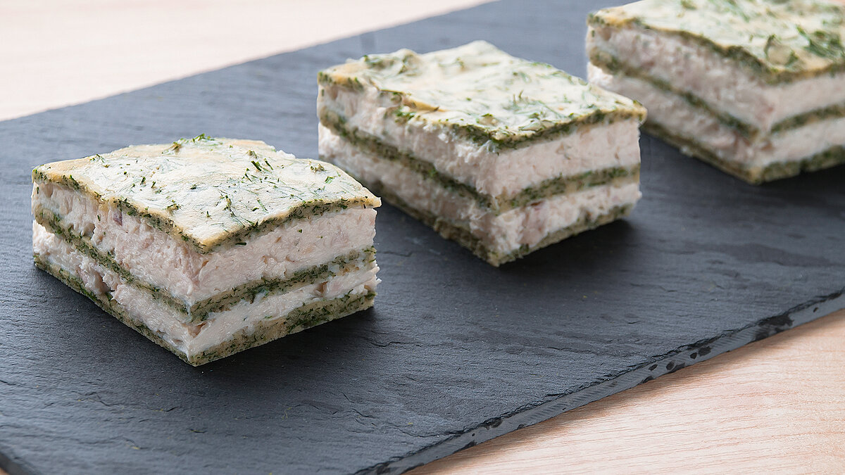 Нам понадобится: Яйца - 3 шт. Соль - 0,5 ч.л. Сушеный чеснок - 1ч.л. Укроп - 100 гр Мука - 0,5 ст. Курица (отварная) - 300 гр Творожный сыр - 200 гр Способ приготовления: 1. Смешиваем яйца, соль, сушенный чеснок 2. Мелко нарезаем укроп и добавляем к яйцам, перемешиваем 3. Просеиваем муку и перемешиваем до однородного состояния 4. Противень застилаем бумагой для выпечки и ровным слоем выкладываем тесто. Выпекаем корж в заранее разогретой духовке 5-7 минут при 180° 5. Куриное филе (или грудку) отварить до готовности и измельчить с помощью блендера. К измельченной курице добавляем соль, творожный сыр, перемешиваем до однородного состояния 6. У готового коржа обрезаем неровные края и делим на 3 части 7. Промазываем каждый слой начинкой и разрезаем на небольшие порционные прямоугольники ПРИЯТНОГО АППЕТИТА! Подробный рецепт приготовления можно посмотреть в видео: Еще больше вкусных, простых рецептов на каждый день или на праздничный стол вы найдете на нашем канале в YouTube: https://www