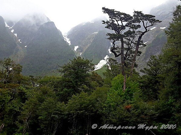 Зачехлив камеры, садимся в машину и едем дальше.. Карретера продолжает пугать нас своей инфернальностью. Еще вчера изумрудная зелень леса сегодня выглядит почти черной и зловещей. Вековечные исполинские деревья, вплотную подступившие к грунтовке, заставляют почувствовать себя хилыми карликами, серый плотный туман, поглотивший вершины Анд, наводит на мысли, что мы попали в царство Аида, откуда нужно поскорее уносить ноги. Тем не менее, словно под гипнозом, околдованные мистической красотой, мы останавливаемся и стараемся запечатлеть этот миг, это состояние, этот новый Лик Карретеры..