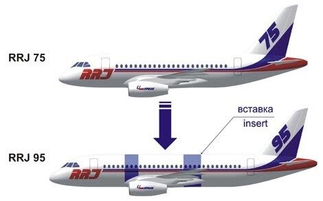 В самом начале, когда SSJ назывался RRJ, базовой версией для всей линейки был именно RRJ-75 — предполагалось, что он заменит все Ту-134 в авиапарке страны. RRJ-95 (будущий SSJ-100) был дальнейшим развитием базовой модели, получаемой добавлением вставок в фюзеляж до и после крыла. Обратите внимание, что тогда никакой речи о переработке планера и шасси не шло, т. е. они подходили обеим моделям. Но, слава Богу, были тогда в нашем авиапроме светлые головы, которые поняли, что вряд ли RRJ-75 сможет составить конкуренцию в этой нише (70-90 пассажиров) самолетам CRJ-700/900 и E-170/175, и все силы были направлены на выпуск SSJ-100.