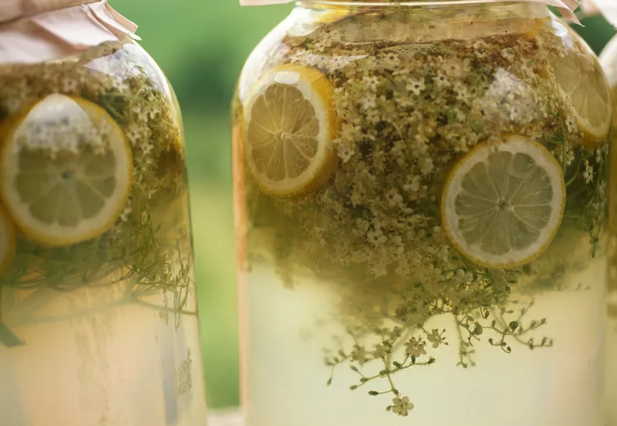 Шампанское из бузины - это натуральный игристый, слегка алкогольный напиток с тонким вкусом. Изготовленное из кружевных кремовых цветов куста бузины. Стоит отметить, что этот ферментированный напиток из бузины технически не является шампанским, потому что он не содержит сортов винограда, используемых для изготовления настоящего шампанского . Но это поколение упоминалось как шампанское из бузины на протяжении поколений, так что здесь используется общее название. Подавайте охлажденным для уникального и освежающего напитка жаркими летними вечерами. Ингредиенты От 7 до 8 больших (6 дюймов или около того) диаметров бузины (или вдвое больше, чем у небольших кластеров бузины) 1 литр кипящей горячей воды (отфильтрованной или не хлорированной) 3 литра холодной воды (фильтрованная или не хлорированная) 0.5 кг. меда (или 0.75 кг. сахара) 1/4 стакана яблочного уксуса (или 2 больших лимонных сока и кожура плюс 2 столовых ложки яблочного уксуса)