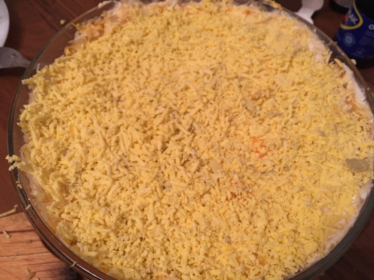 Этот салат наверняка всем знакомый, подойдет для праздничного стола так и для повседневного меняю. Это Мимоза - рецепт салата достаточно лёгкий и быстрый приготовлении а самое главное невероятно вкусный! Наша семья очень любит этот салат! Поэтому он всегда на нашем праздничном столе! Ингредиенты очень простые Картофель - 4 шт Яйца - 4 шт Морковь - 2 шт Сыр - 200 гр Лук - у меня половинеа Консерва у меня сайра - 1 банка Майонез По желанию можете добавить зелень для начала нам нужно отварить картофель, морковь и яйца, остудить и почистить. Важно все натираем на мелкой тёрке (картошку, морковку, белки, желтки и сыр) открываем консерву сливаем лишнюю жидкость и разминаем вилкой. Лук заливаем кипятком и оставляем на 10 минут, что бы ушла горечь, и нарезаем на кубики Смазываем нембольшим количеством майонеза следующий слой отварной картофель Добавим майонез Следующий слой яичный белок , так же натёртый на мелкой тёрке . Этот слой майонезом не смазываем! Морковь натираем и выклады