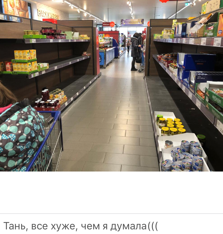«Все хуже, чем я думала». Такое сообщение получила я вчера от подруги, живущей в Германии. Она писала прямо из местного магазина. И выслала фотографию открывшегося перед ней вида. Вот такого: На полках практически полностью отсутствовали все базовые продукты. «В чем дело?», - спросила я. И получила такой ответ: «Да коронавирус тут кошмарит». Далее подруга стала перечислять все то, чего ей не удалось обнаружить на полках магазина. «Муки вообще нет. Та же история с сахаром. Консервы почти все раскуплены! Представляешь, почти все», - строчила она мне сообщение за сообщением. А потом я получила от нее радостные смайлики. И сообщение: «О, две пачки макарон нашла!». «А при чем тут коронавирус? Он что съел все продукты?» - пыталась шутить я. На что подруга написала, что «уже перекрыли один город, потому что там много заболевших коронавирусом. И в магазине возник такой ажиотаж» . То ли люди боятся лишний раз в магазин заходить, чтобы оградить себя от возможных контактов с переносчиками виру