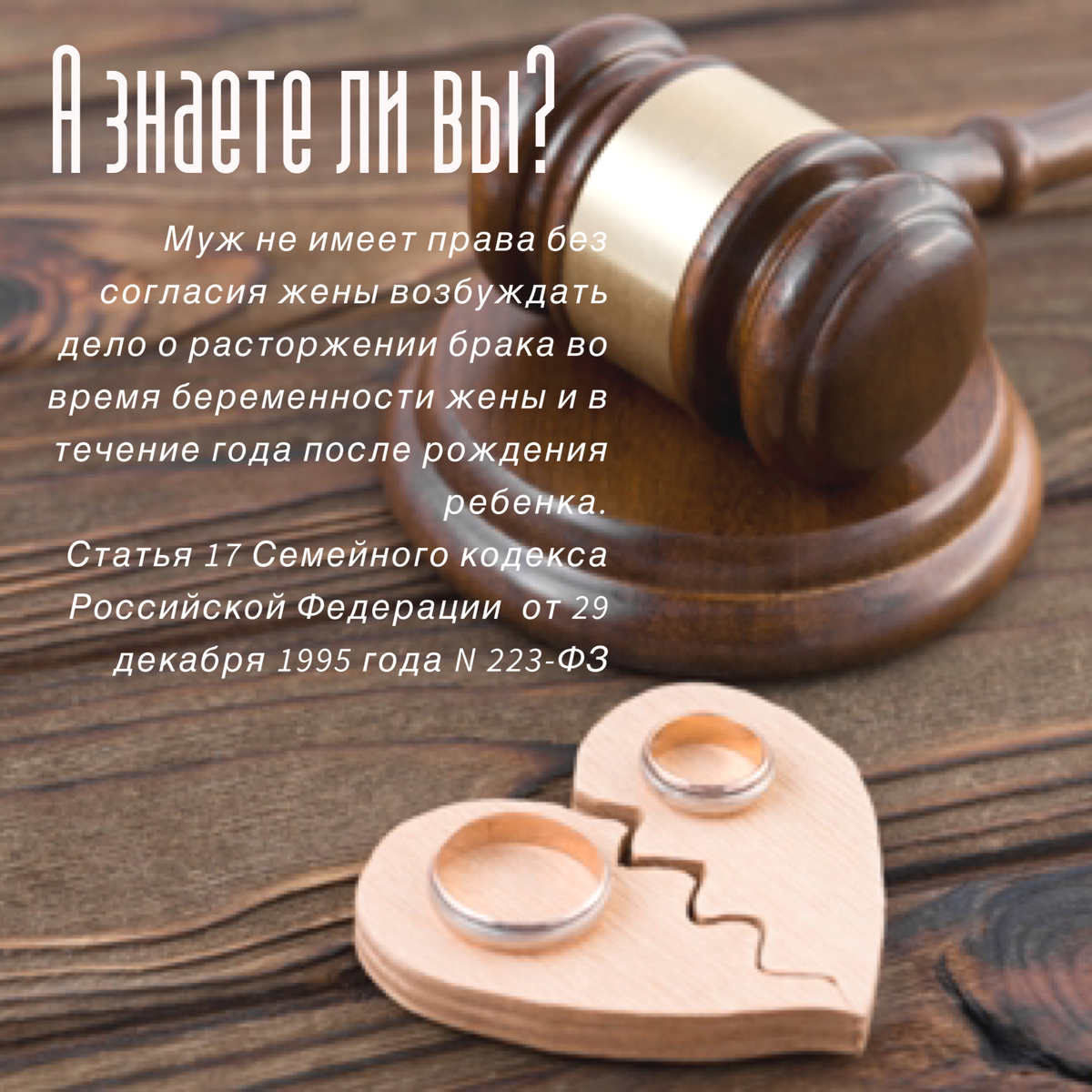 ⠀ 📌При принятии искового заявления о расторжении брака судье необходимо учитывать, что согласно ст. 17 СК РФ муж не имеет права без согласия жены возбуждать дело о расторжении брака во время беременности жены и в течение одного года после рождения ребенка. ⠀ 📍Это положение распространяется и на случаи, когда ребенок родился мертвым или умер до достижения им возраста одного года. ⠀ ❌При отсутствии согласия жены на рассмотрение дела о расторжении брака судья отказывает в принятии искового заявления, а если оно было принято, суд прекращает производство по делу (п. 1 ч. 1 ст. 134, абзац 2 ст. 220 ГПК РФ). ⠀ ‼️Указанные определения не являются препятствием к повторному обращению в суд с иском о расторжении брака, если впоследствии отпали обстоятельства, перечисленные в ст. 17 СК РФ.