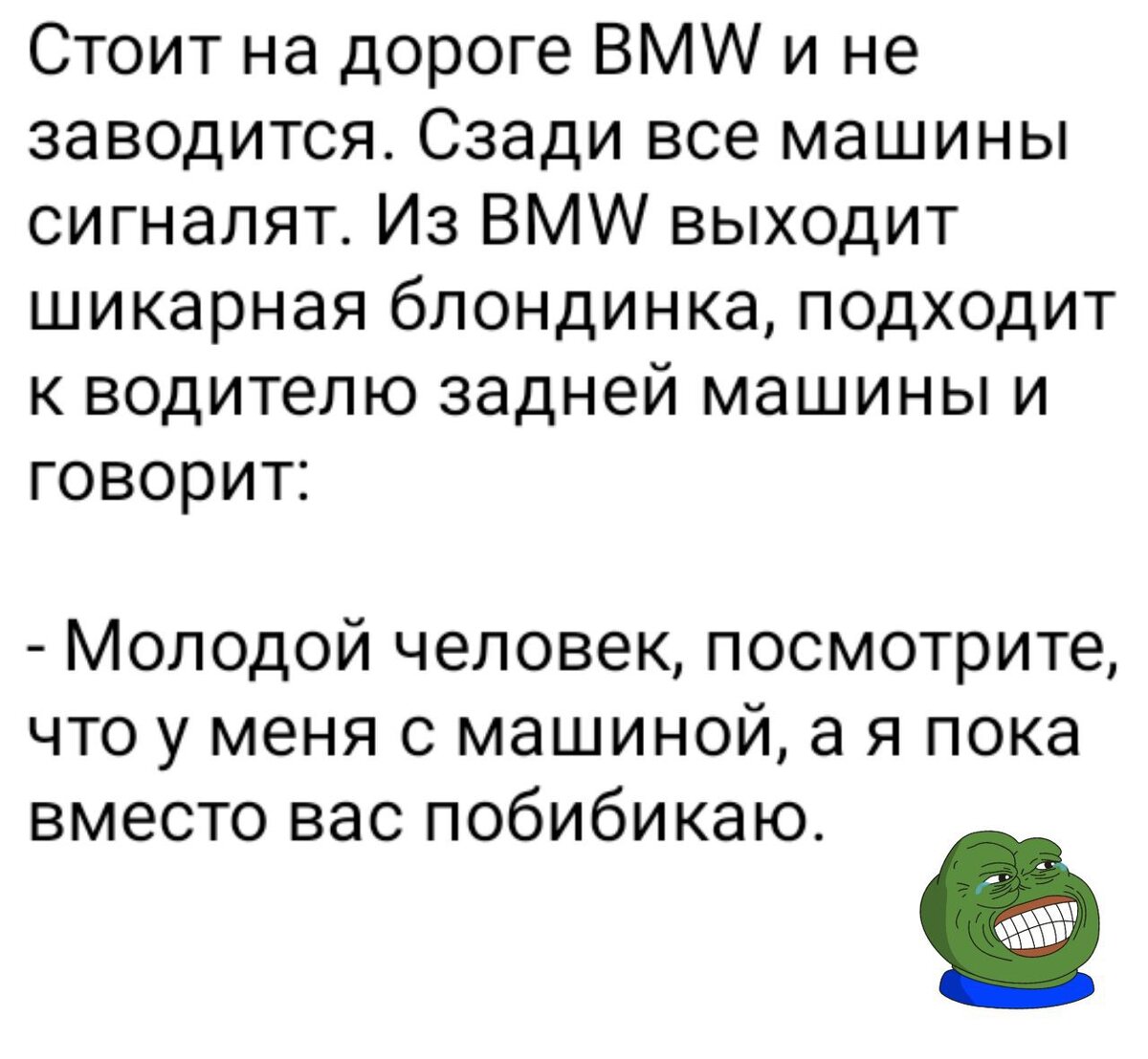 *** - Димон, что ты так долго с женой по телефону разговаривал? - Сань, ты просто не знаешь, какая она глупая! Я ей объясняю а она ничего не понимает. Ругался на весь двор . Ко мне даже строители подъехали, спросили, куда цемент выгружать, подумали, что я прораб. 😂 *** Дежурный по роте подходит к молодому дневальному: - Полковник не заходил? - Нет. - Если придет, сразу же скажи мне . И так раз пять. В роту приходит полковник Дневальный: - Это ты что-ли полковник? - Да, я. И что? - Как что? Где ты ходишь уже пол дня!? Тебя сержант уже розыскался. 😂 *** — Расскажи как со своей женой познакомился? — Совершенно случайно, в пицерии столкнулись лицом к лицу. Она посмотрела в мои глаза, улыбнулась и сказала: теперь ты будешь моим парнем! — А ты как себя повёл? — А я тогда курил много. Через пару кварталов выдохся, она и догнала. Спасибо за внимание. Поддержите лайком друзья!😋