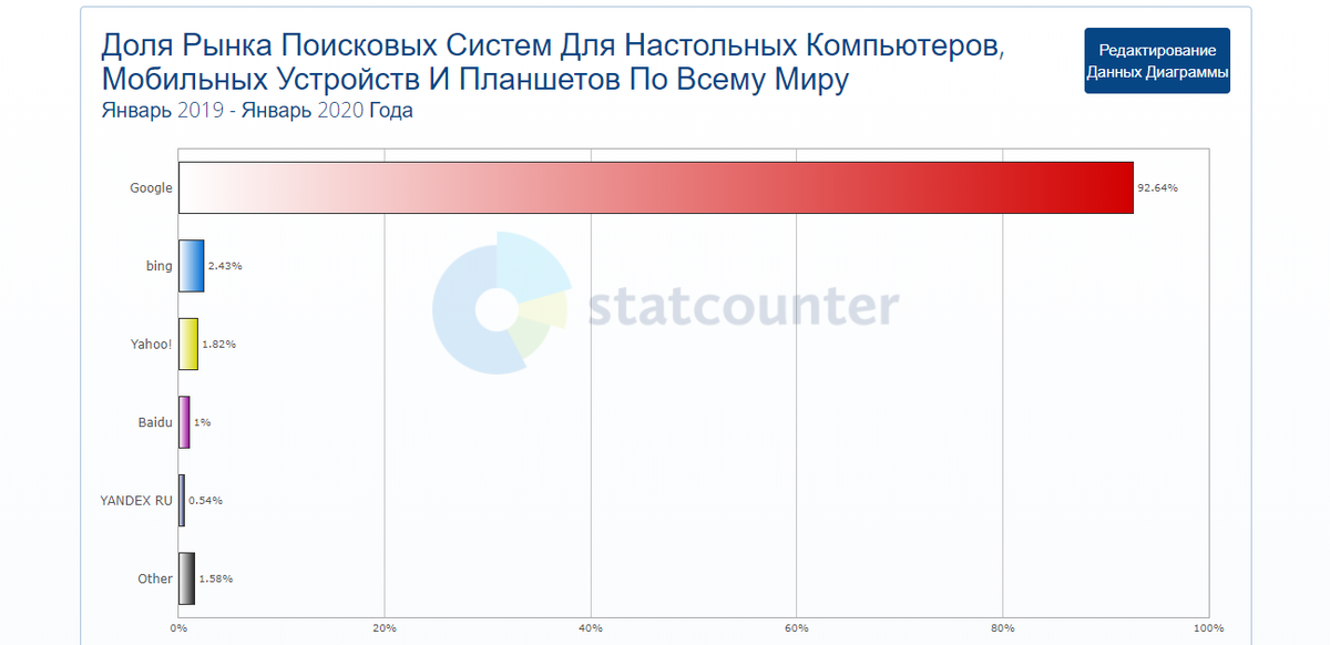 Предупреждаю, что статистика не является точной на 100% процентов и учитывает только компьютеры, ноутбуки, смартфоны и планшеты. Но это самая наглядная и приближенная статистика, которую мне только удалось найти. Какой же поисковик "Номер 1 в мире?" Ожидаемо - Google. Удивительно, что в топ в мире, пусть и с минимальным процентом, попал поисковик - Yandex. Ну, если с мировым лидером, все было очевидно, то что в других странах? Рассмотрим: Продолжаем и на этот раз увидим статистику по России Тут уже "конкуренция" более плотная и Google впереди всего лишь на 0,5%. И Яндекс вплотную на втором месте. Что же по соседним странам? Кто лидер в Украине? Здесь абсолютный лидер - Google, а Яндексом пользуются лишь 5%. В Беларуси точно так же? Не совсем, здесь Яндекс уже более популярен, и 22% пользуются им, но Google все также очевидный лидер. Переходим к Северной и Южной Америке Тут уже совсем было очевидно. Также отслеживается то, что в Северной Америке побольше людей пользуются bing и Yahoo! П