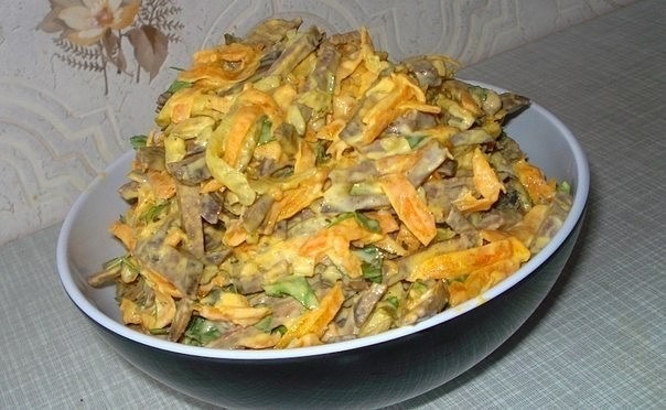 ИНГРЕДИЕНТЫ: ● 0,5 кг говяжьей или телячьей печени ● 2 морковки ● 2 луковицы ● 3 средние соленые огурцы (200 г) ● 1 банка консервированного зеленого горошка ● соль, перец, майонез по вкусу. ПРИГОТОВЛЕНИЕ: Печень отварить в подсоленной воде, охладить и натереть на крупной терке.Лук порезать четверть кольцами, поджарить на растительном масле до прозрачности, добавить потертую на крупной терке морковь и потушить пока морковь не станет мягче. Снять с огня, охладить. Огурцы порезать тонкой соломкой или натереть на крупной терке. Открыть банку горошка, сцедить жидкость. Соединить все ингредиенты, посолить, поперчить по вкусу, заправить майонезом, перемешать. Выложить в глубокий салатник, украсить зеленью, подать к столу. Совет: если есть время и терпение, все ингредиенты порезать очень тонкой соломкой. Лучше салат с печенью подходит теплым (по крайней мере не холоднее комнатной температуры), поэтому перед подачей на стол его следует заранее достать из холодильника. Приятного аппетита!