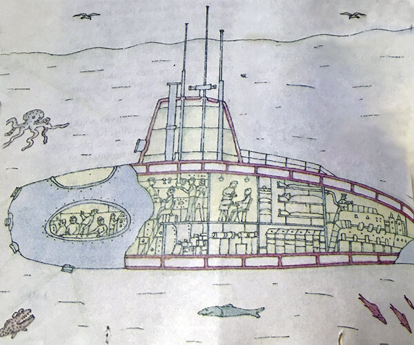 Брось в воду какое-нибудь стеклышко - оно мигом пойдет ко дну. А кинешь в воду пустую закупоренную бутылку - тоже стеклянную - она преспокойно поплывет. Если же наполовину заполнить эту бутылку водой, она наполовину погрузится. Чудеса? Никаких чудес нет. Всё дело в невидимке-воздухе. Он легкий, легче всего. А воздуха то в пустой стеклянной бутылке стало меньше, вода его вытеснила. Вот бутылка и стала тяжелее. Когда вода вытеснит из бутылки весь воздух и бутылка до горлышка заполнится водой - она тоже утонет, как та стекляшка. Так любым кораблям, в том числе и подводной лодке, не дает утонуть воздух. На рисунке красной краской изображены внутренние стенки подводной лодки - стальные, тяжелые и наружные, тоже стальные, но полегче. А что между внутренними и наружными стенками? Что капитану корабля нужно, то и будет: прикажет воду - будет вода, прикажет воздух - будет воздух. Надо погрузиться в море - капитан даст команду: "Открыть краны!" - и вода из-за борта с шипением заполнит щель