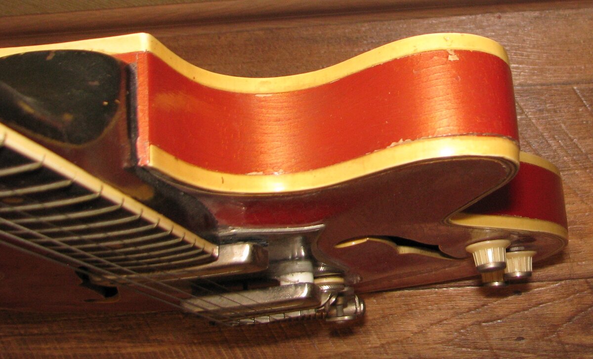 Гриф тоже освежен ремонтом головки, покраской, лакировкой. Проведена рихтовка, шлифовка и полировка ладов. Отрегулирован анкер. Колки хотелось оставить оригинальные и пришлось искать новые шестерни для механизма.