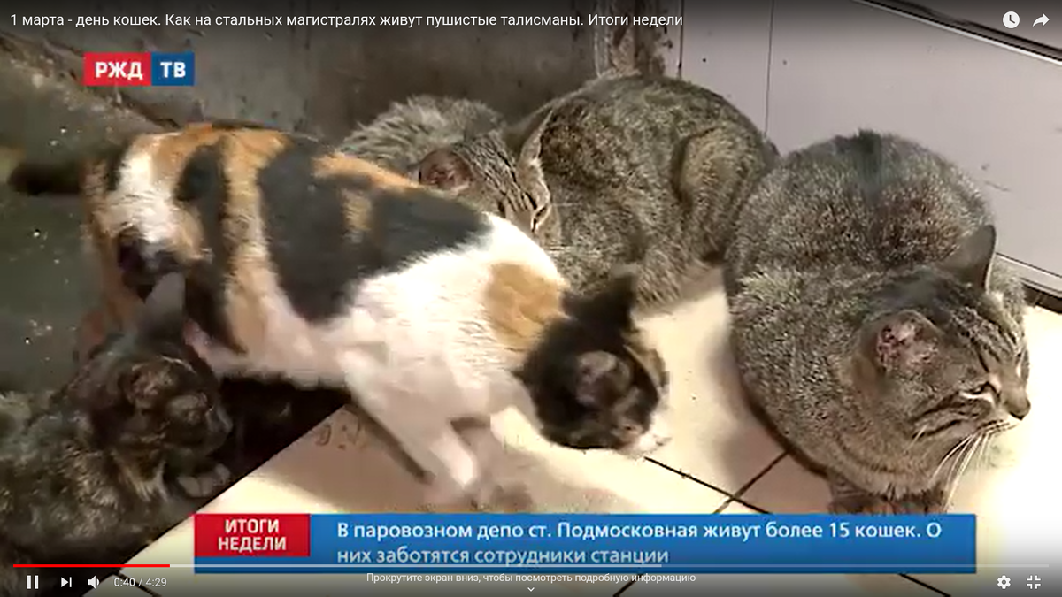 1-го марта в России отмечают День кошек. У праздника нет официального статуса, но в нашей стране его справляют владельцы и любители этих животных. По данным географического сервиса «Всемирный Атлас», в России обитают около 12,5 млн кошек. И для некоторых из них настоящим домом стала железная дорога. История паровозного депо на станции Подмосковная насчитывает больше сотни лет. Сегодня оно - памятник истории и архитектуры регионального значения и находится под охраной не только государства, но целого отряда кошек. Говорят, что здесь их живёт около пятнадцати. Здесь они нашли крышу над головой, пропитание и заботу от сердобольных сотрудников депо. Есть примета, что трехцветная кошка охраняет дом от пожара и других несчастий. Среди кошачьего клана Подмосковной - это Масяня. Она как талисман и одна из старейшин. И в этом «кошкином доме» образовались уже целые династии усатых железнодорожников. К 5 лет назад на железнодорожном вокзале Архангельска появился свой пушистый дежурны