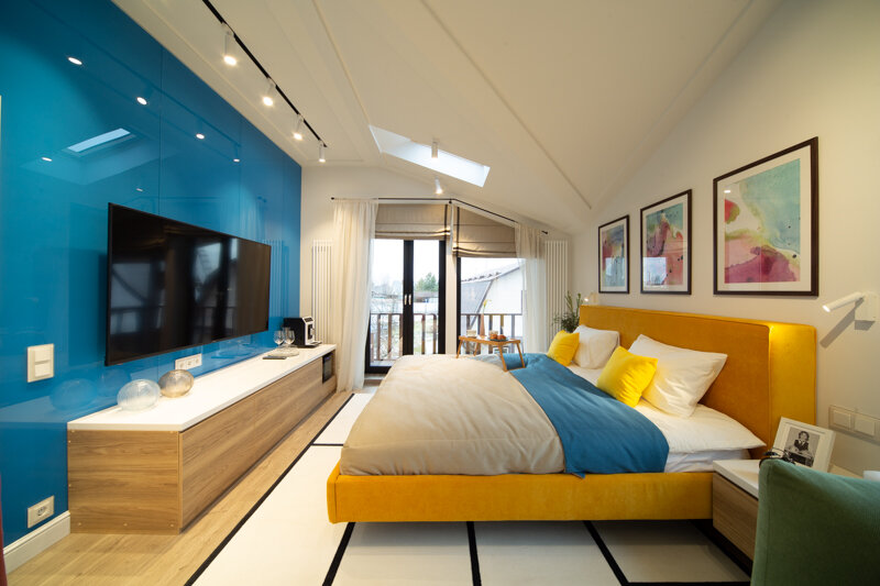 Немного о деталях. Самая яркая и задающая настроение всей комнате синяя стеклянная стена восхищает нас до сих пор. Большой телевизор, кофемашина, винный шкаф, мансардные окна, большая кровать, какие же удобные кресла, какая же прекрасная у нас балконная дверь – все это предел мечтаний.