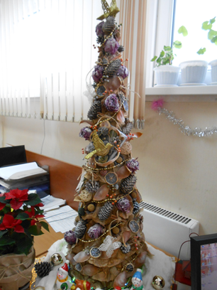 Никогда не думала, что я займусь изготовлением елок. На работе объявили конкурс «Оригинальная елка». Наш отдел решил участвовать, зная о моих творческих способностях. На работу я притащила два больших пакета всего, что только могло бы пригодиться для елки. Я не знала пока из чего она будет и даже не представляла. Захватила еще рулон картона для выкроек (коричневый), на всякий случай. Елку придумывала прямо на работе. Благо работа позволяет. И так в основе свернутый конусом картон для выкроек. Дальше начались муки творчества. Как лепить, что лепить, на что лепить. Творческие люди меня понимают. Захватила с собой крафтовые пакеты и просто бумагу крафтовую. Нарезала полоски, помяла и степлером сделала складки. Приклеила полученные воланы по спирали сверху вниз. Далее по передней части приклеила засушенные розы. Их предварительно обработала акриловым лаком из баллончика. Затем приклеивала их в чашеобразную штучку из крафтовой бумаги, а потом уже клеила на елку. Далее приклеила засушенны