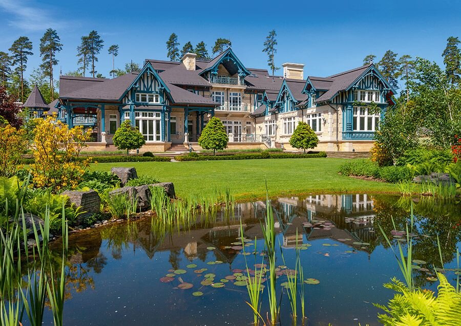 Автор проекта: архитектор Антон Шаруденко Элегантный особняк, спроектированный в духе французской архитектуры конца XIX века, находится в элитном коттеджном поселке Довиль в Подмосковье. Дом построен в живописном месте — вблизи от небольшого естественного озера, на территории с довольно сложным рельефом и перепадами высот. Наличие водоема определило композицию генерального плана и расположение здания на участке. Из основных помещений открываются прекрасные виды на окружающий ландшафт и береговую линию. При создании концепции проекта, от формирования общей идеи объемно-планировочного решения до разработки деталей фасада, архитектор учитывал пожелания заказчика и в итоге выполнил все поставленные задачи, оставшись в рамках исторической нормандской архитектуры, но адаптировав старинный стиль к современным условиям и материалам. В ходе строительства автор проекта контролировал каждый этап и постоянно контактировал с фирмами-посредниками, что гарантировало оптимальный результат. Рель