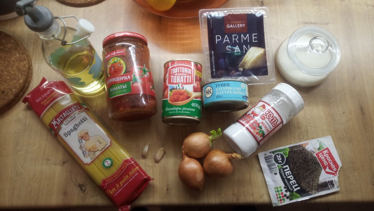 Сегодня хочу поделится одним из моих любимых блюд. Этот рецепт я узнал от моих родных которые прожили не мало времени в Болоньи в Италии. Попробовав макароны "по новому" я не мог оторваться от тарелки и скушал две добавки. С тех пор это блюдо неотъемлемая часть моей жизни. Этот рецепт очень прост в приготовлении. Ингредиенты легко найти на полках в магазинах. Занимает по времени 1 час. Получается оочень вкусно! Ингредиенты: Способ готовки: Делается соус, в соус добавляются сваренные спагетти, тертый сыр добавляется в горячее готовое блюдо. Начинаем готовить! Перед тем как начать разогревать сковородку, рекомендую почистить лук и мелко нарезать. 1. Разогреваем хорошо сковородку, наливаем масло (в этот раз я использовал подсолнечное) и добавляем 2 целых неочищенных зубчика чеснока. Мешаем и жарим 2 минуты. 2. Добавляем лук и постоянно мешаем чтобы не подгорел. 3. Добавляем помидоры. Я их добавляю прям так, целиком. А потом придавливаю их лопаткой до почти однородной массы. Нужно по