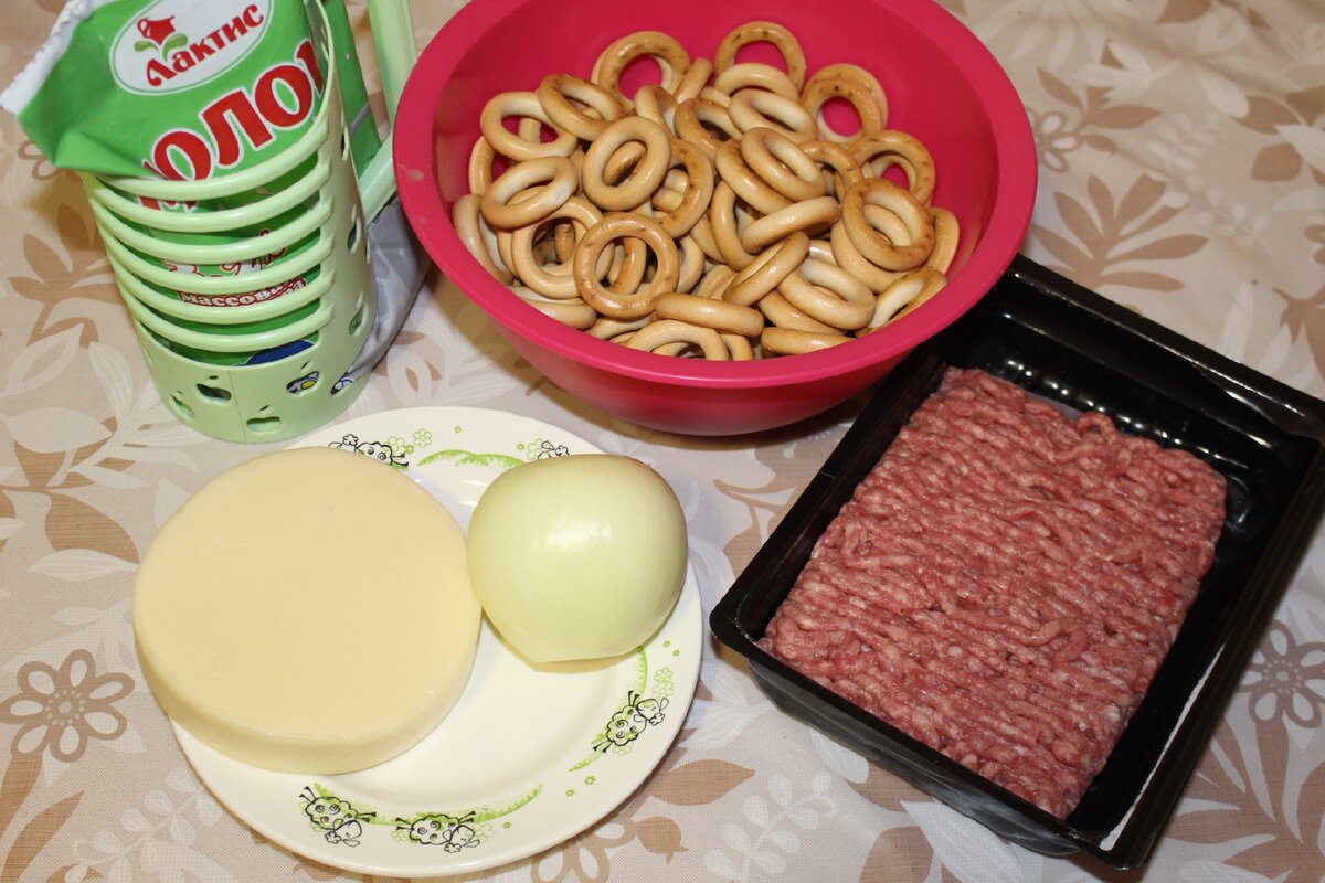 Готовится из сушек, мясного фарша, сыра и, так нелюбимого некоторыми читателями, майонеза.