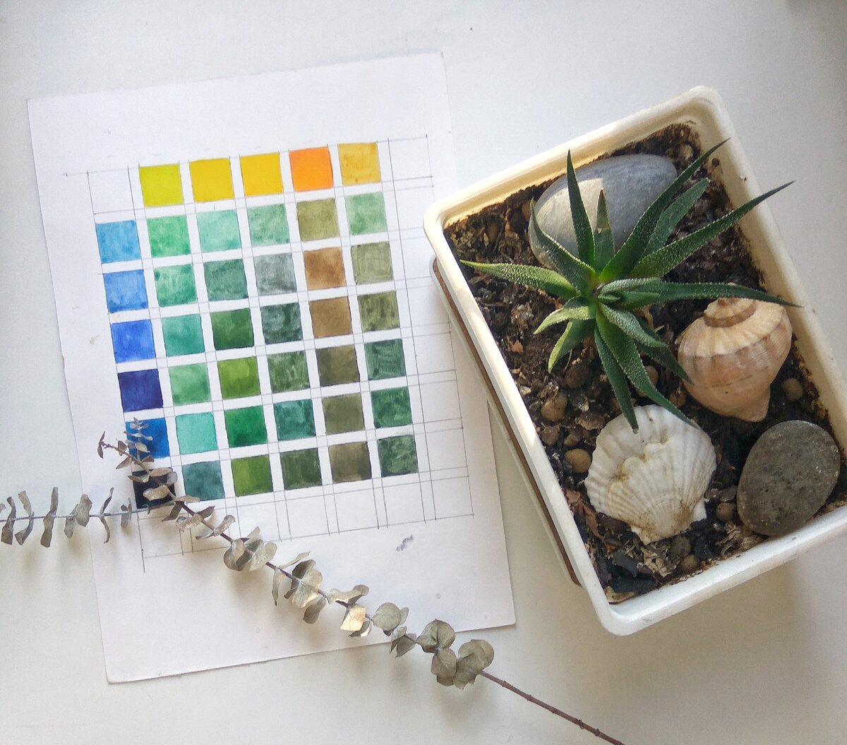 Скоро всё зазеленеет! Кому-то радость, а художникам головная боль на пленэре. Зимой рисуй без затей – небо серое, земля белая, всё остальное бурое. Работу можно сделать из разных пропорций ультрамарина и коричневых. То ли дело весна! Набирающий силу зелёный шум никак не решить общей массой. Весной мы наблюдаем великое разнообразие зелёных оттенков. Одни из них яркие, насыщенные, другие – приглушённые. Кроме прочего, есть свет и тень, зелень на фоне неба, зелень на фоне земли. Всё это необходимо различить и дать каждому оттенку своё место. Хороший совет, который слышал каждый живописец, – убрать всю готовую зелень из палитры, заменив её смешением разных синих и жёлтых пигментов. Это разумно, поскольку даже одна пара – один синий плюс один жёлтый – даёт в разных пропорциях богатую палитру. Чтобы рассмотреть максимальное количество вариантов, я взяла все синие пигменты из большой коробки "Белых ночей" и все пигменты, которые хотя бы отдалённо напоминают жёлтый цвет. Перечислю синие све