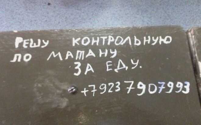Студенческие годы – время, когда смекалка является очень важной вещью. Она позволят протянуть до стипендии, прикрепить шпаргалки так, чтобы никто не догадался, и выжить в суровых студенческих общагах. О том, как это бывает весьма креативно, смотрите нашу фотоподборку. 1. Иногда так случается, что денег нет совсем, а стипендия будет только через 3 дня. Вот и приходится крутиться. 2. В студенческих комнатах редко можно встретить микроволновку. Выяснилось, что фен отлично ее может заменить. 3. Что делать, если сосиски хочется есть горячими? Обогреватель поможет в этом. Загрузка… 4. Жаль, что в студенческих общежитиях в комнатах запрещены плитки. Если бы разрешили, то не пришлось бы «насиловать» чайник. 5. Американские студенты тоже могут быть без денег. Эта девушка сообразила, как можно себя прокормить: набрать в баклажку в столовой бесплатного молока. 6. Что делать, если лекцию пропустить нельзя, а футбол так хочется посмотреть? Придумать кое-что с пеналом.