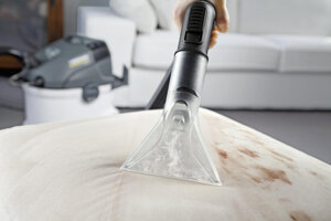 Если покрытие не боится кратковременного влияния воды, его очищают с помощью экстракторов – устройств, подающих к обрабатываемой поверхности жидкий моющий состав. После того, как жидкость растворяет загрязнения, ее сразу же удаляют специальным пылесосом.