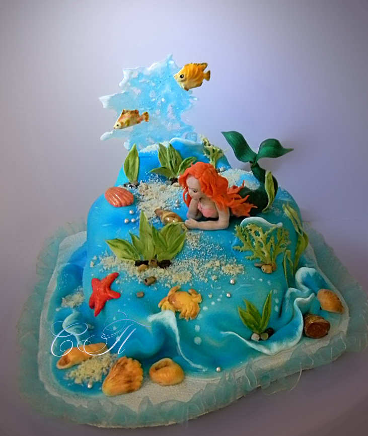 Этому торту много лет, его маленькая пятилетняя хозяйка-именинница очень любила мультик про Русалочку. Поэтому папа ее и попросил сделать торт с сюжетом морским, русалочьим. Сейчас эта девочка стала уже девушкой, а я помню те радостные фотографии, присланные мне со дня рождения.