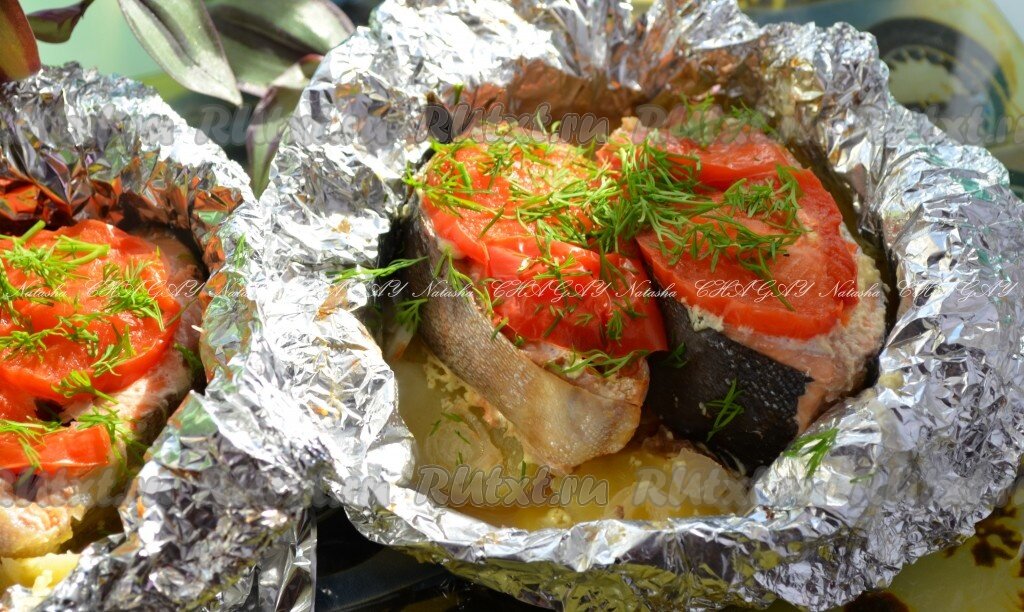 Предлагаю запечь горбушу с картошкой в духовке в фольге. Это очень простое и вкусное блюдо. А запекание делает его еще и полезным. Ингредиенты Для приготовления горбуши с картошкой в духовке вам потребуется (на 2 порции): 2-4 порционных кусочка горбуши (зависит от размера); 2-4 картофелины; 1 маленький помидор; 0,5 репчатого лука; немного сметаны или майонеза; соль и специи - по вкусу; зелень для украшения; фольга. Этапы приготовления Картошку очистить и нарезать тонкими кружками. Горбушу посолить и по желанию поперчить или посыпать специями. На блестящую сторону фольги выложить слой картофеля, посолить, посыпать специями (у меня специальные специи для картошки), слегка смазать сметаной или майонезом. На картошку положить 1 или 2 кусочка горбуши (зависит от размера и ваших предпочтений), посыпать тонко нарезанным луком. Тоже слегка смазать сметаной или майонезом. Сверху уложить помидоры, нарезанные кружочками. Можно их немного присолить. Завернуть фольгу конвертиком и
