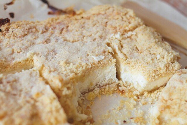 4. Форму для пирога застелить пергаментом. Насыпать половину песочной крошки, сверху выложить начинку. Засыпать оставшейся крошкой. Выпекать при 200 градусах 30 мин.