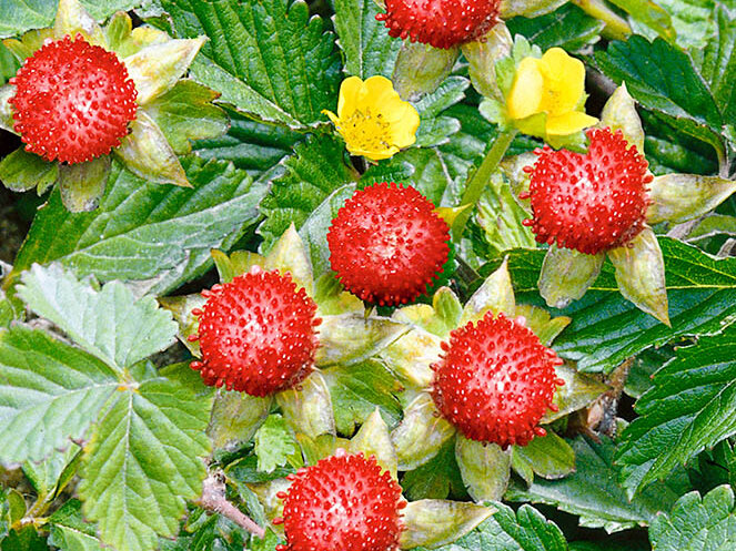 Удивительно праздничное настроение создают поляны из этого растения. Дюшенея внешне очень похожа на землянику: у нее такие-же тройчатые листья, она так-же дает огромное количество усов. Разрастаясь, дюшенея заполняет собой все пустующие места. С ранней весны до поздней осени дюшенея покрыта желтыми цветками и красными ягодами.