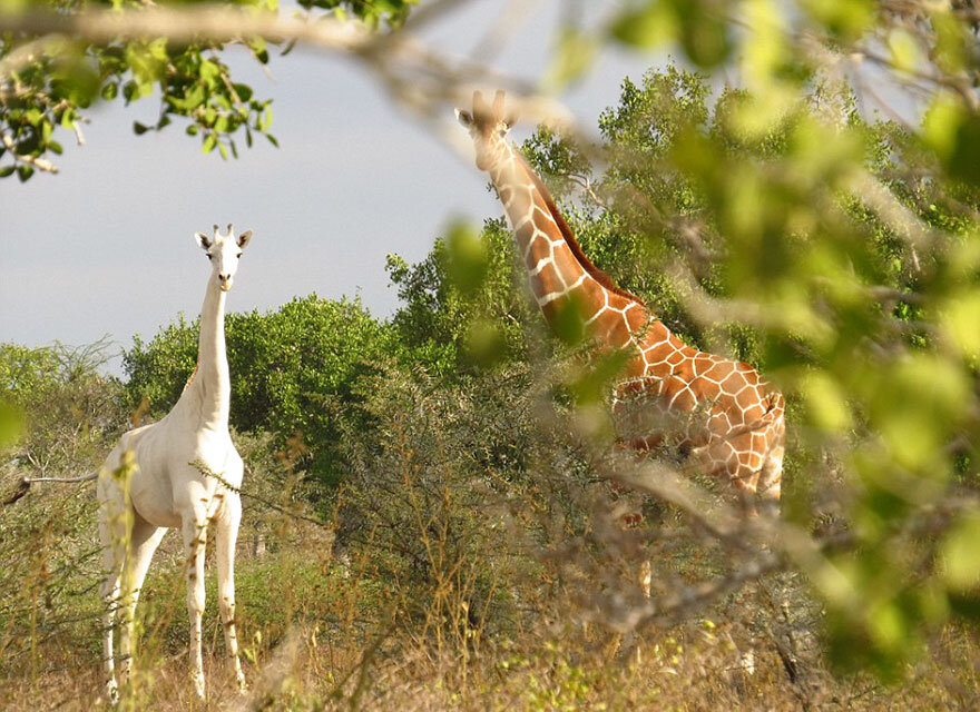 «Природа всегда ошеломляет и продолжает удивлять человечество! Эти редкие белоснежные жирафы шокировали многих местных жителей, включая и меня, но это придало нам новый заряд энергии для защиты и спасения нашей уникальной дикой природы» - говорил директор и основатель HCP (Hirola Conservation Programme - Кенийская неправительственная организация по защите дикой природы), д-р Абдуллахи Али, когда несколько лет назад местные жители обнаружили семью белых жирафов в заповеднике Ишакбини. Но недавно жирафы пропали, и спустя несколько месяцев худшее из опасений подтвердилось. Теперь в семье белых жирафов остался только детёныш убитой самки, и он, предположительно, последний в мире. Ранее таких же белых жирафов браконьеры истребили в Танзании и Эфиопии. При наблюдении за животными можно увидеть исчезающую сетчатую окраску на их коже. У взрослого жирафа это менее заметно, чем у малыша. Необычный окрас этих жирафов вызван не альбинизмом, а лейкизмом — мутацией, вызывающей частичную потерю пиг