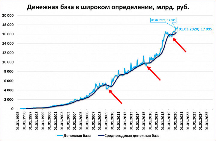 На 1 марта 2020 года денежная база (в широком определении) составила 17,1 трлн. рублей. График 1. Это чуть ниже исторического рекорда, установленного месяцем ранее (17,3 трлн.) и второй месяц подряд выше отметки в 17 триллионов. Нас, как всегда, интересуют данные в реальном выражении, то есть с поправкой на инфляцию. В постоянных ценах 2016 года денежная база уже не выглядит такой растущей, как на первом графике. График 2. График прекрасно объясняет, почему в первые два срока президента Путина в стране экономика бурно развивалась, а затем уже более 10 лет находится в стагнации. Дело в том, что если в 1999-2007 годах денежная база выросла на порядок, то затем она остановилась и находится на одном и том же уровне десятилетие. Без изменения политики ЦБ ситуация так и будет оставаться стагнационной. На 1 марта реальная денежная база на 5,2% выше, чем годом ранее. График 3. Однако среднегодовой уровень денежной базы сейчас на 1,8% ниже прошлогоднего значения. Ситуация дальше может развива