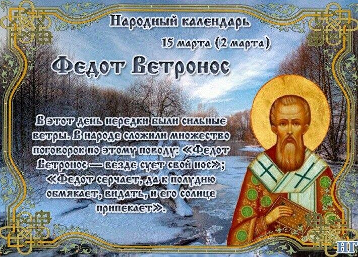 По церковному календарю этот день называют Федотов день в честь священномученика Феодота, епископа Киринейского. Другие названия – Федот Снежный занос, Ветронос, Пометальник, Водомет. По народным поверьям, в этот день ждали оттепели, так как считалось, что именно сегодня «закипают» все подземные ключи и выливаются на землю последней оттепелью. С погодой не поспоришь, и иногда вместо оттепели 15 марта случаются и сильные заморозки. В таком случае в народе говорилось: «Федот, да не тот». Следовало обращать внимание на следующие погодные условия: дождь и снег указывали на то, что еще долго не будет свежей травы; теплый день – к теплому и дождливому лету; морозный день – к холодному. Интересной приметой в этой день была следующая: нужно приобрести красную герань (при покупке ни в коем случае не торговаться) и поставить дома на подоконник – так, считалось, можно задобрить домового, и он перестанет вредничать в этом доме, а станет, наоборот, всячески защищать жильцов и жилище. Считалось, ч