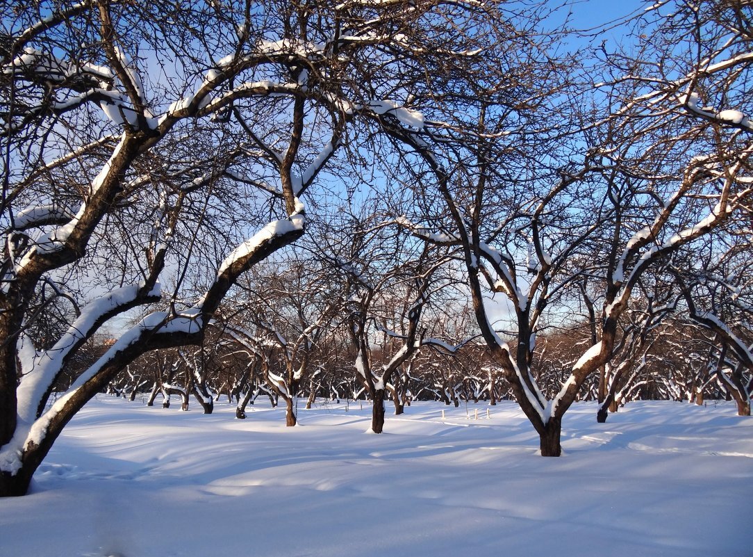 Ясный зимний день. Солнце светит ослепительно ярко. Вокруг все белым-бело. Мягкий пушистый снег ровным слоем покрыл землю. Снег повсюду: на скамейках, на крышах домов, на деревьях. Деревья стоят в снегу, словно яблони в цвету. Белые-белые. И только кое-где виднеются красные гроздья рябины. Под рябинами много птичьих следов. Вороны, снегири, синицы прилетают поклевать ягоды. Очень нарядна под шапками снега ель. В чистом воздухе пахнет хвоей. Красив зимний наряд и у березок. Холодно. Под ногами скрипит снег. Из трубы маленького запорошенного снегом домика в небо столбом идет дым. День морозный. Мороз сковал льдом речку. Ребята с радостными криками, размахивая руками, спускаются на санках с крутого берега реки. Им не страшен мороз. Им весело. А снег блестит на солнце, искрится, переливается. Но зимний день короткий. Незаметно и быстро наступят сумерки