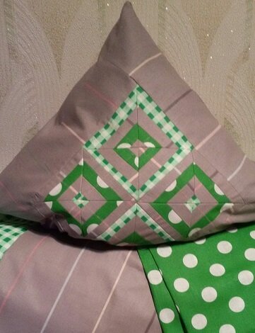 Я, в данном случае, решила сшить наволочку на маленькую подушку. Размеров наволочки у меня пока не было. Теперь сшиваем четыре блока, утюжим. А вот теперь я измерила подушку и, недостающие по размеру полоски ткани пришила к своим блокам.