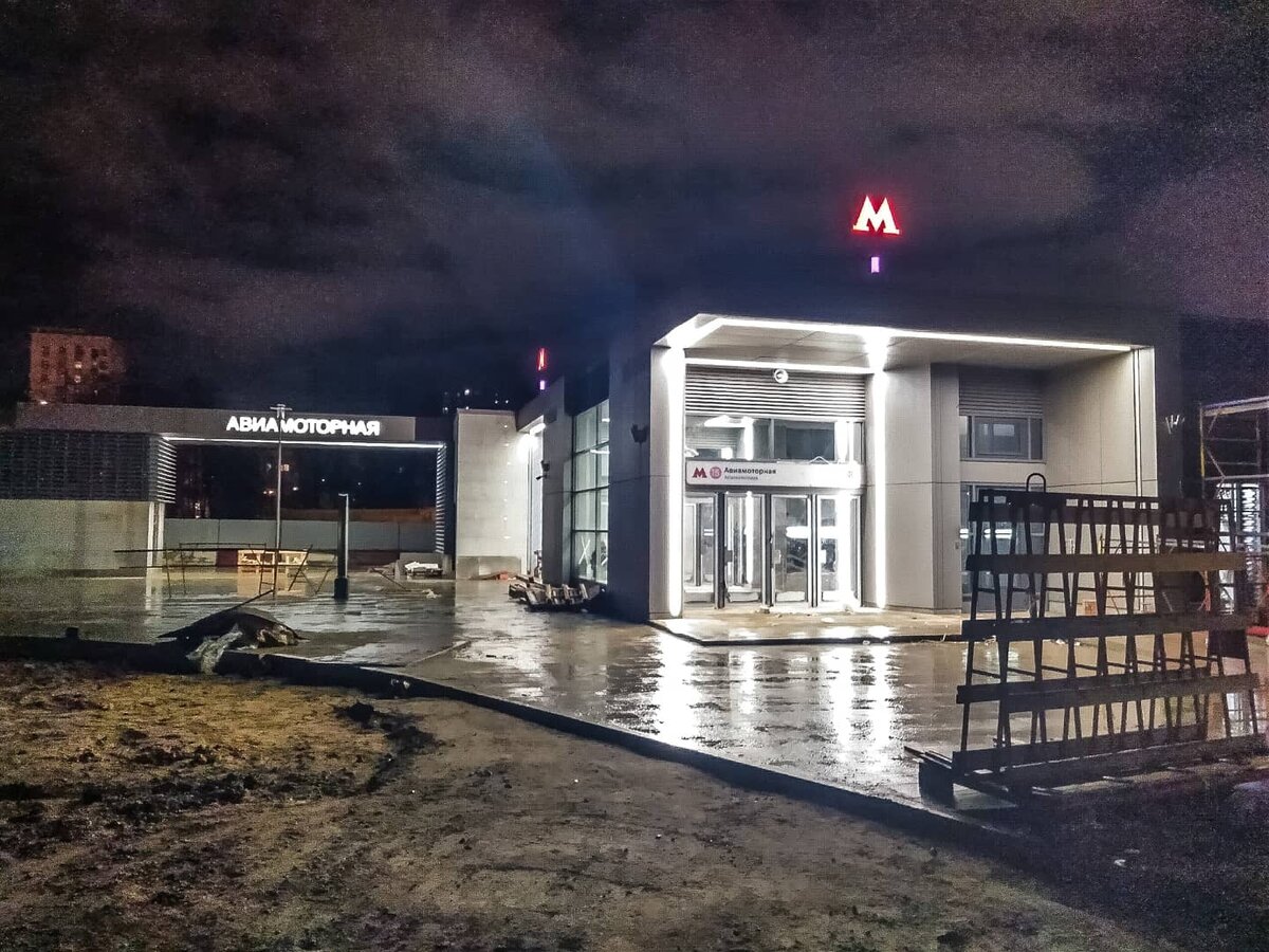 Первый проект строительства хордовой линии с пересадочным узлом на станции «Авиамоторная» появился в 1985 году. Этот проект неоднократно корректировался. В феврале 2011 года было объявлено о планах строительства новой Кожуховской линии от «Авиамоторной». Согласно первоначальному проекту, предполагалось сделать «Авиамоторную» станцией глубокого заложения. В ноябре 2011 года планы были скорректированы, и было решено построить станцию мелкого заложения. Также планировалось, что станция «Авиамоторная» войдёт в состав транспортно-пересадочного узла. В апреле 2012 года было заявлено, что Кожуховская линия (в 2018 получившая название Некрасовская линия) может быть продлена от «Авиамоторной» в центр города. Позже было решено, что будет построена в составе Некрасовской линии, а затем будет передана в состав Большой кольцевой линии. Строительство Для освобождения площадки под строительство станции и транспортно-пересадочного узла был закрыт и снесён Лефортовский рынок. Расположение и вестибю