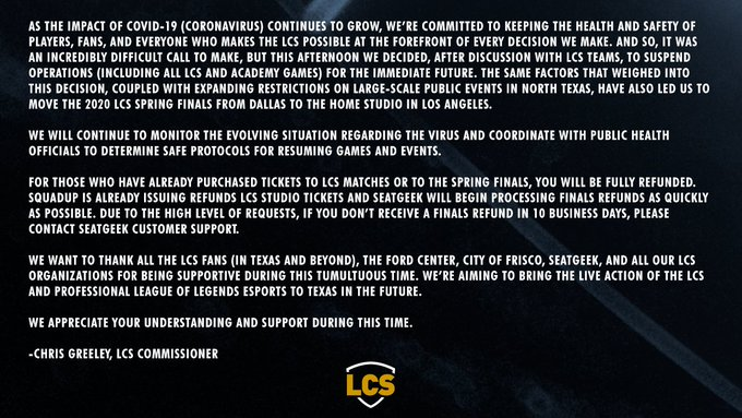 «Те же факторы, которые повлияли на это решение в сочетании с расширяющимися ограничениями на масштабные публичные мероприятия в Северном Техасе, также побудили нас перенести весенний финал LCS 2020 года из Далласа в домашнюю студию в Лос-Анджелесе», - продолжил