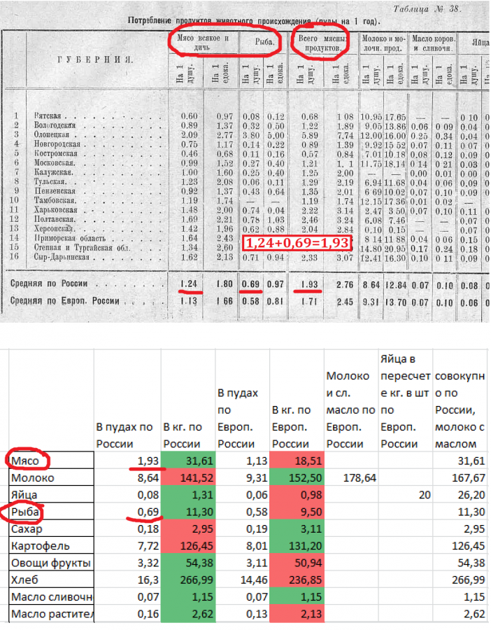 то дальше делает genby? Он берет не только мясо, но и рыбу -- из графы "Всего мясных продуктов", а потом в своей табличке дает еще отдельно рыбу. Таким образом, завышая данные на 0,69 пуда или на 11,3 кг.