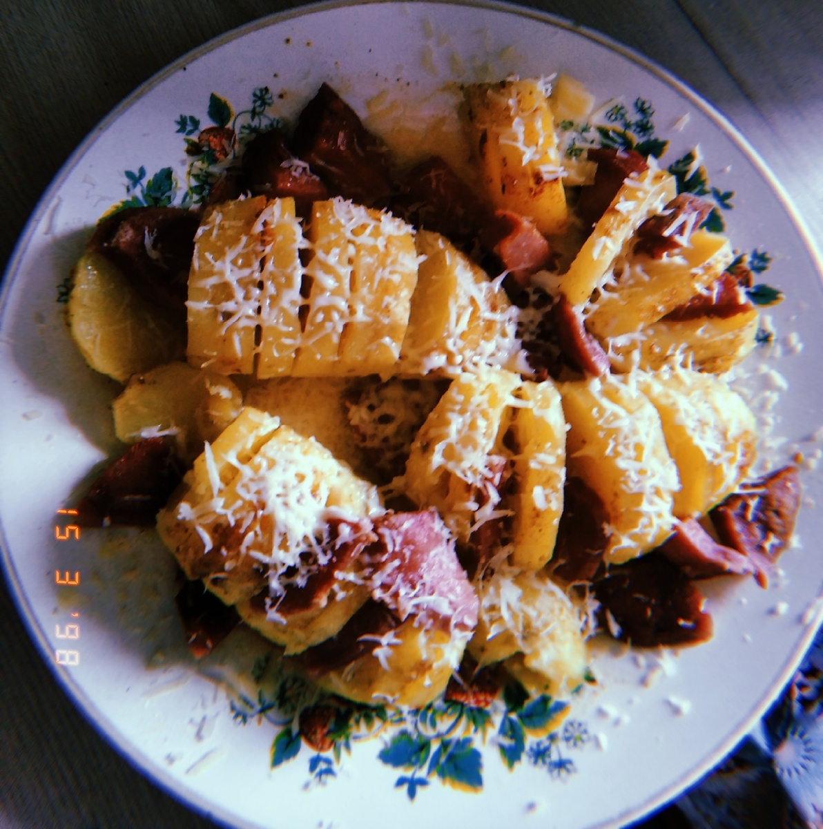 Здравствуйте! Хочу попреветствовать всех читателей, и пожелать отличного настроения. Мне черезвычяйно приятно представить вам эту страницу. Сегодня я впервые решила открыть страницу про простые и вкусные рецепты, так как люблю готовить и хочу поделиться своими рецептами. Я долго думала стоит ли открывать ее, и все таки решилась. Надеюсь у меня что то получиться. Буду счястлива увидеть любые комментарии и просмотры. Запечённый картофель в микроволновке Сегодня у меня было хорошее настроение и думала что нибудь приготовить. Подумав, я решила приготовить запечённый картофель в микроволновой печи. Рецепт: 1) 2-4 картошки(смотря сколько хотите сделать порций) 2) подсолнечное масло 3) приправы подходящие к картошке 4) соль по вкусу 5) бекон, или колбаса 6) пакет для запекания 7) сыр Приготовление: Подготавливаем ингредиенты. Картошку чистим, не до конца делаем надрезы. Картошку с надрезами кладём на тарелку и посыпаем приправами, солью по вкусу, затем немного наливаем на картошку подсолн